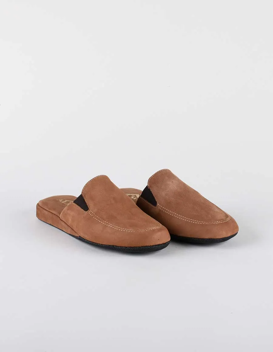 Pantofola uomo marrone chiaro in pelle martellata, inserti laterali in elastico per facilitare la calzata. Sottopiede imbottito per il massimo comfort. Suola 3 cm. Tomaia in pelle, interno in pelle e suola in gomma.