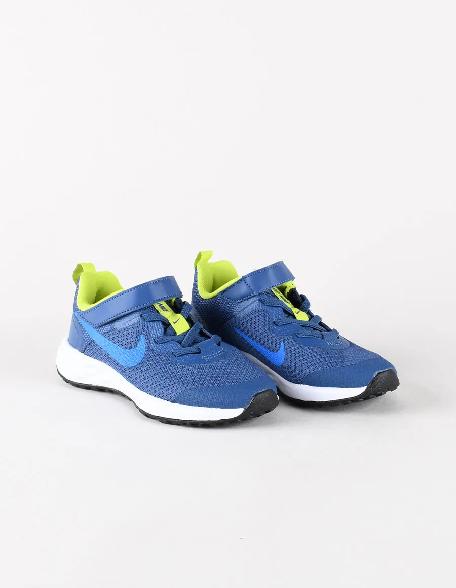 Sneaker bimbo blu notte con swoosh a contrasto royal e dettagli verde fluo. Realizzata con il 20% di contenuto riciclato sul peso. Leggera, traspirante e ammortizzata. Tessuto leggero per la traspirabilità e freschezza. Strato esterno sul tallone per supporto e stabilità per movimenti multidirezionali. Schiuma sotto il piede per una morbida ammortizzazione ad ogni passo. Battistrada in gomma per trazione e resistenza. Chiusura con strappo velcro regolabile. Tomaia in tessuto, interno in tessuto e suola in gomma.
