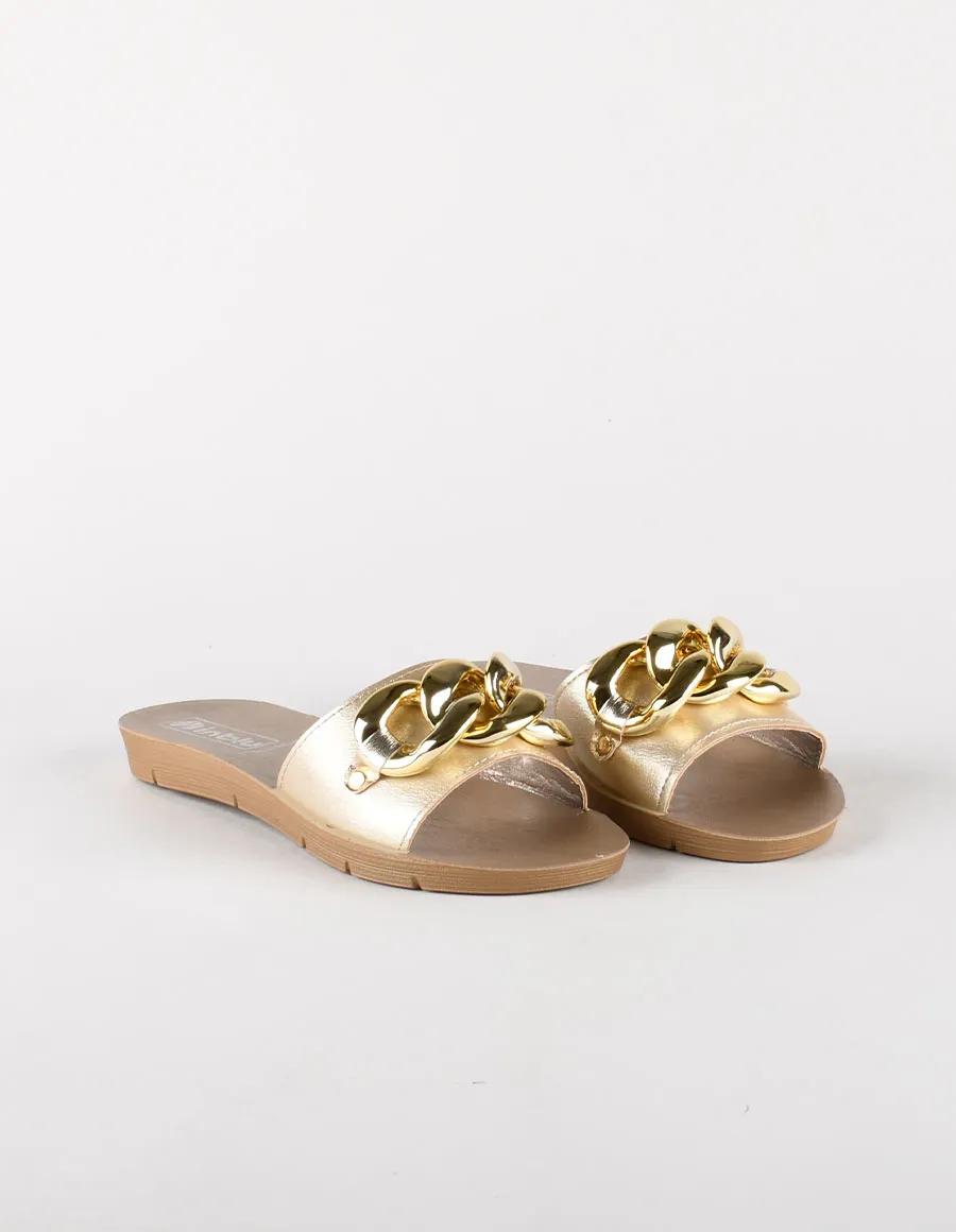Ciabatta donna oro pallido con maxi applicazione catena oro su fascia. Suola 2 cm. Tomaia in ecopelle, interno in ecopelle e suola in gomma