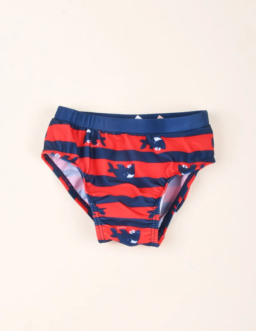 Costume slip bimbo blu notte con stampa a righe rosso all over e squali a contrasto. Realizzato con materiali riciclati. Materiale: 83% polyestere 17% elastane