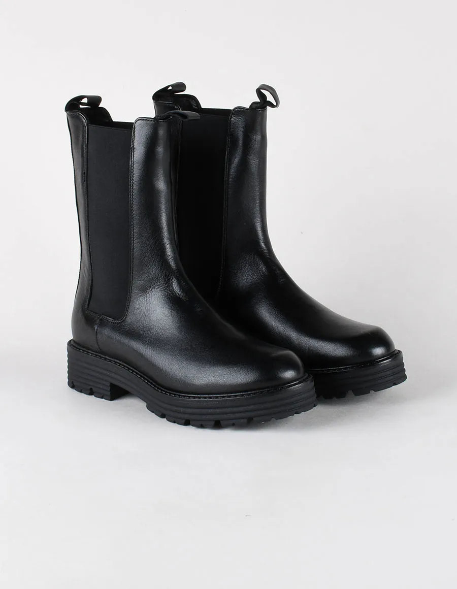 Chelsea donna nero alto al polpaccio con iconici elastici laterali per facilitare la calzata. Suola carrarmato con tacco 4 cm. Tomaia in pelle, interno in pelle e tessuto, suola in gomma