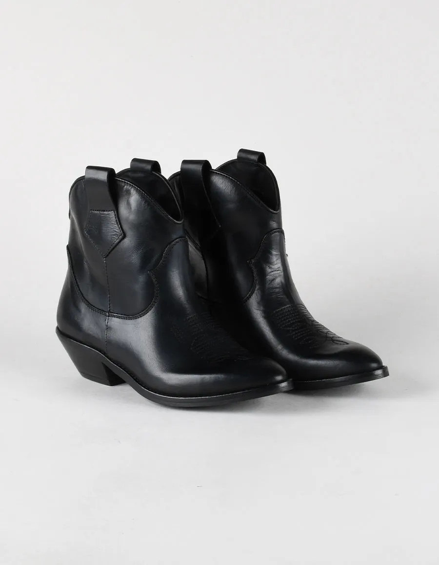 Stivaletto texano donna nero alto alla caviglia con impunture a decorazione tono su tono. Tacco 4 cm. Tomaia in pelle, interno in tessuto, suola in gomma. Made in Italy