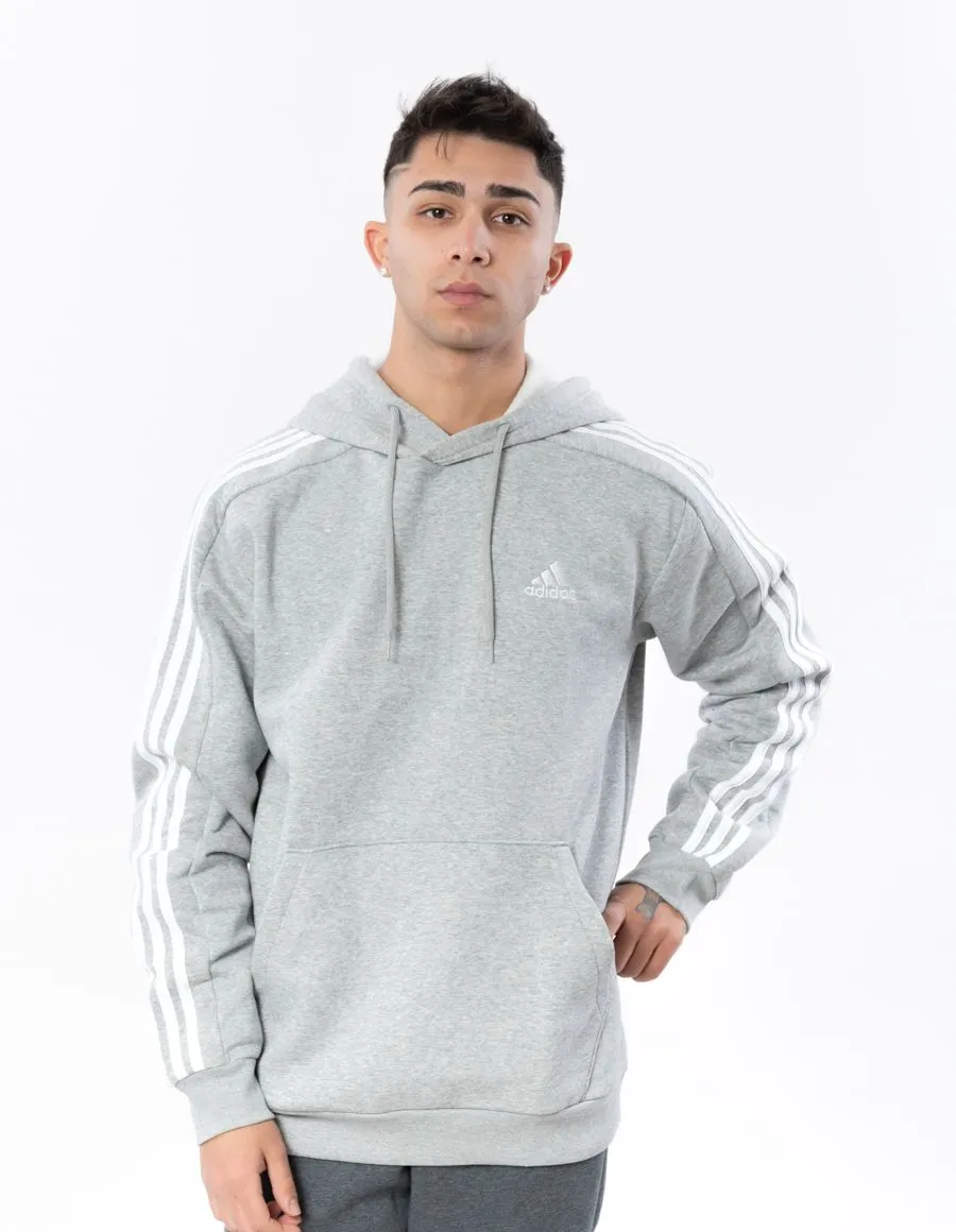 Felpa uomo grigia con cappuccio e tasca marsupio. Logo a contrasto bianco sul petto e stripes su maniche. Interno felpato. Vestibilità regular. Prodotto realizzato con almeno il 70% di materiali riciclati. Materiali: 78% cotone, 22% poliestere.