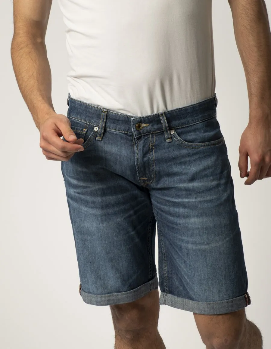 Bermuda in jeans misto cotone uomo a lavaggio medio. Vita bassa con risvoltino. Chiusura frontale con bottone e cerniera lampo. 5 tasche. Prodotto realizzato con cotone riciclato. Vestibilità: slim fit. Materiali: 80% cotone, 12% lyocell, 5% elastomultiestere e 3% elastane. Codice prodotto: M4GD05WG3OA.