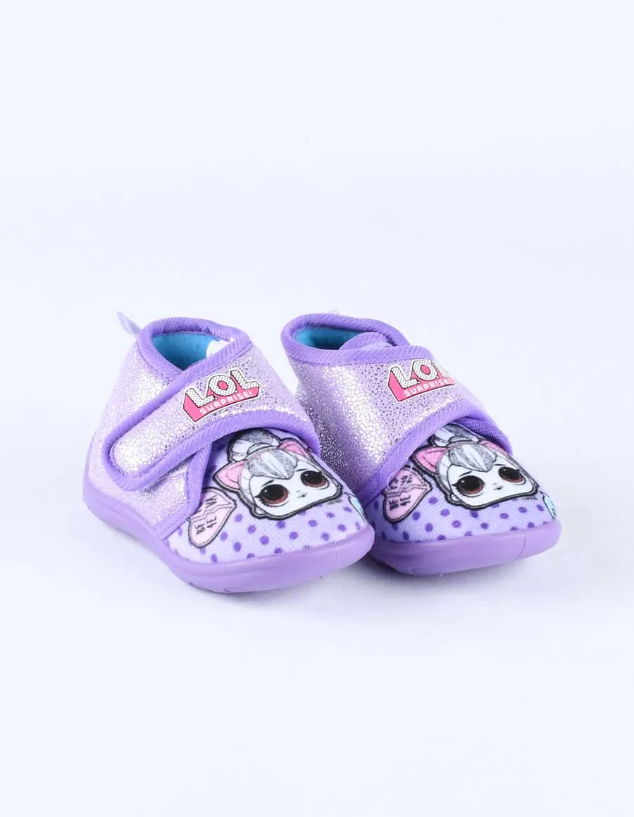 Pantofola lilla in tessuto profilata con stampa bimba e tessuto metallizzato. Chiusura a strappo con velcro. Tomaia in tessuto e suola in gomma