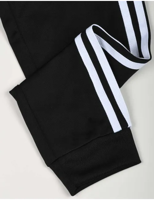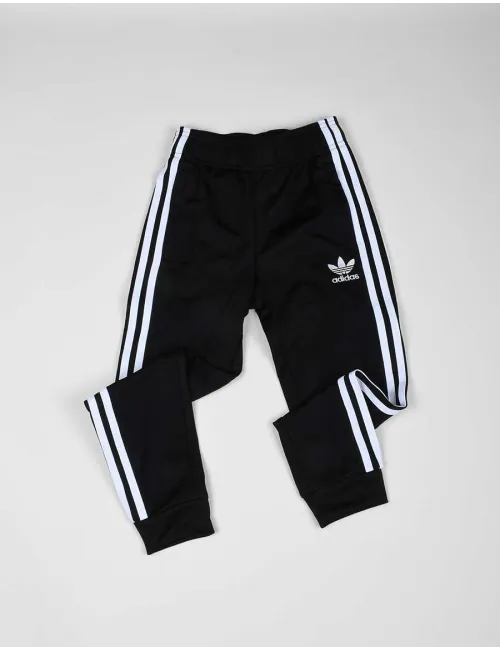 Pantalone bimbo nero in acetato con logo ricamato e tre stripes a contrasto bianco. Elastico in vita e coulisse nascosta. Materiale: 100% poliestere.