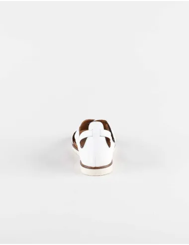 Sandalo donna bianco con fascie incrociate sul collo del piede. Chiusura regolabile con strappo velcro. Suola con rialzo interno di 1,5 cm per un maggior comfort. Altezza tacco: 1,5 cm. Tomaia in pelle, interno in pelle e suola in gomma