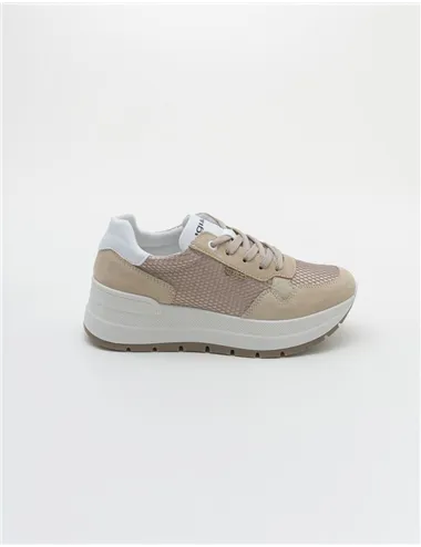Sneaker da donna colore beige-red. Caratterizzata da una tomaia in pelle martellata con dettagli scamosciati. Chiusura con lacci e zip laterale. Dettagli in pelle pitonata rossa. Suola spessa in gomma alta 4 cm. Tomaia in pelle, tessuto e ecopelle, interno in tessuto e ecopelle e suola in gomma.