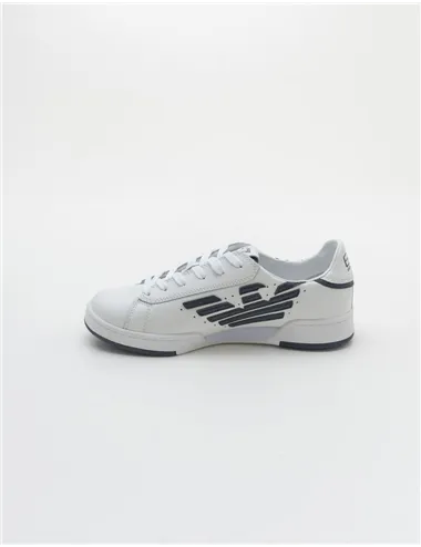 Sneaker da donna colore bianco-nero e leopartadato. Punta rotonda in gomma. Tomaia in ecopelle martellata con fantasia leopardata. Chiusura con lacci e zip laterale. Targhetta in metallo canna di fucile con marchio, applicata ai lacci. Vegane. Suola a carrarmato alta 5,5 cm. Tomaia in ecopelle, interno in tessuto e suola in gomma.