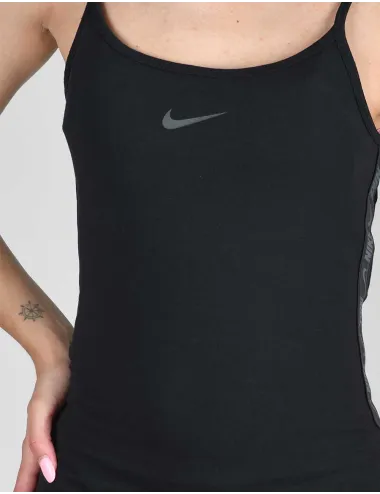 Leggins nero a vita alta con inserti in mesh semi trasparente. Logo a contrasto bianco. Vestibilità aderente. Tecnologia DryFit che aiuta a fare evaporare velocemente il sudore. Materiale: 78% poliestere 22% elastane