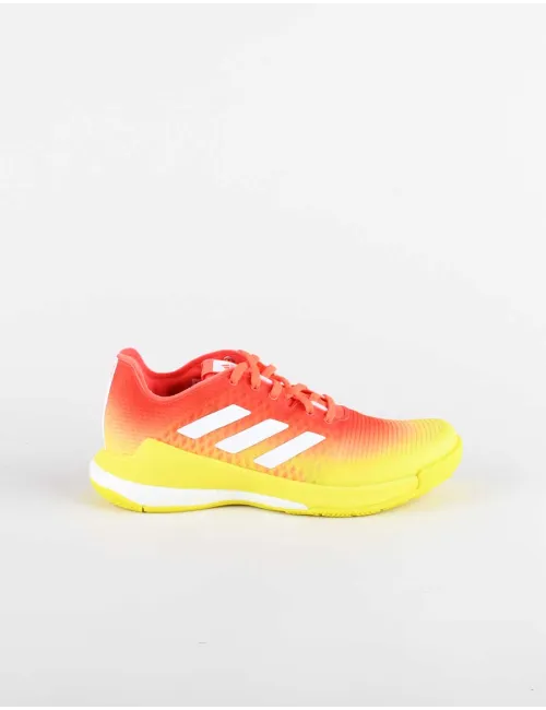 Scarpa da pallavolo donna gialla con contrasto rosso e corallo fluo, tre stripes bianco laterale, ideale per l'indoor. Profilo basso. L'intersuola Boost fornisce l'ammortizzazione necessaria per eseguire salti con atterraggi morbidi. La tomaia mid-cut leggera è protetta da una struttura in EVA che assicura stabilità e supporto. Calzata regolare, chiusura con lacci, tomaia leggera e robusta in mesh elasticizzato, struttura interna in tessuto knit avvolgente, rinforzi in TPU sull'arco plantare, soletta sagomata e intersuola Boost, suola in gomma pensata per offrire il massimo grip. Tomaia in tessuto ed ecopelle, interno in tessuto e suola in gomma. NB. Il colore giallo e corallo nella realtà sono più tendenti al fluorescente.