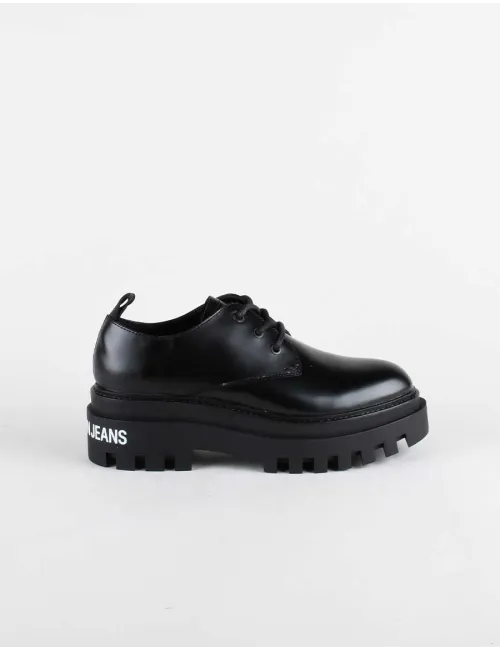 Allacciata donna nera in pelle lucida con oinguetta posteriore per facilitare la calzata. Suola platform con maxi carrarmato 6,5 cm. Tomaia in pelle, interno in tessuto e pelle, suola in gomma.