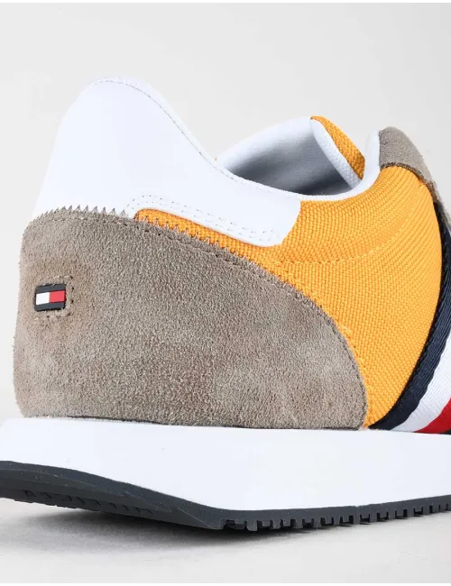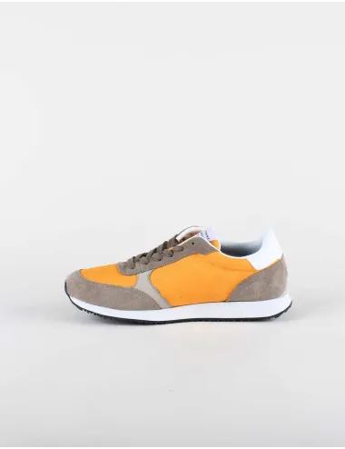 Sneaker uomo gialla con contrasti sabbia, dettgli iconici e pelle scamosciata. Sottopiede estraibile. Tomaia in pelle, interno in tessuto e suola in gomma