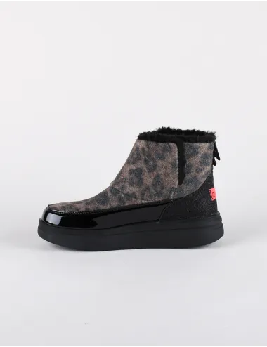 Polacchino bimba nero con inserto in tessuto maculato a contrasto. Logo fucsia sul tallone, linguetta posteriore per facilitare la calzata ed interno in calda ecopelliccia. Tomaia in tessuto ed ecopelle, interno in tessuto e suola in gomma.