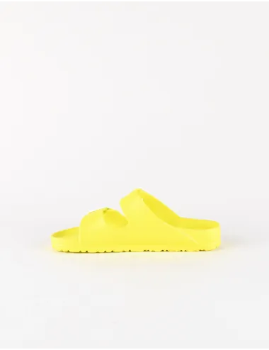 Ciabatta donna giallo fluo a doppia fascia con listini regolabili. Modello idrorepellente ideale per spiaggia o piscina. Realizzati in EVA e sono super flessibili e morbidi. Come parte della filosofia del nostro marchio, sono disponibili in una scatola di cartone riciclato, qualcosa di essenziale per coloro che vogliono contribuire positivamente all'ambiente. Tomaia, interno e suola in gomma.