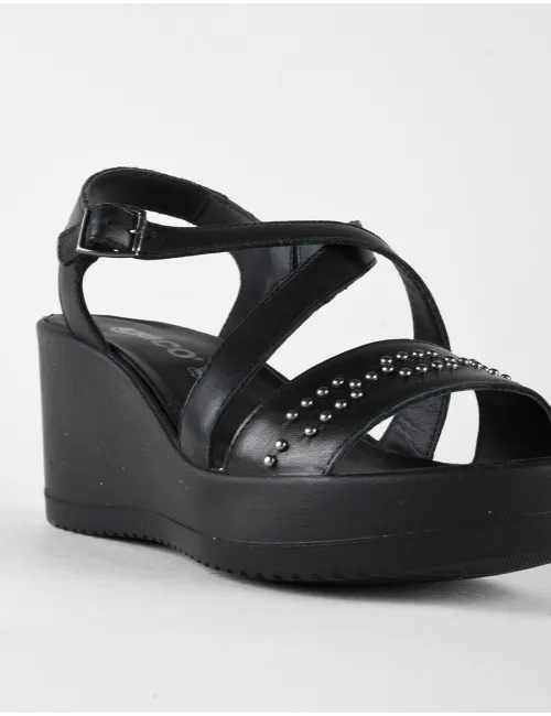 Sandalo donna nero con incrocio sul collo del piede e borchiette canna di fucile applicate. Chiusura con listino regolabile su caviglia. Tacco 7 cm. Tomaia in pelle, interno in pelle e suola in gomma.