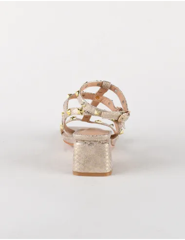 Sandalo donna con applicazioni metalliche oro. Listino regolabile alla caviglia. Ecopelle realizzata con effetto pitone. Tacco 6 cm. Tomaia in ecopelle, interno in ecopelle e suola in gomma