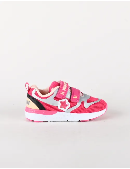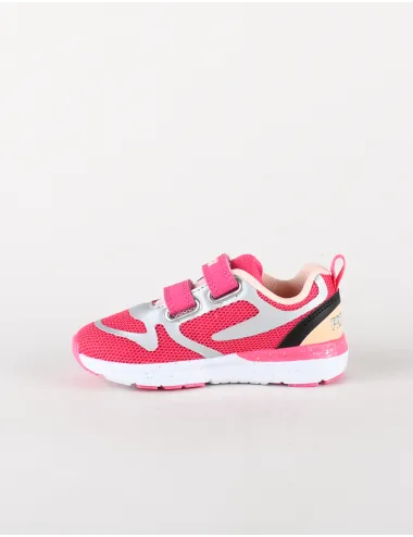 Sneaker bimba fucsia con contrasti melone e argento. Modello con chiusura a doppio strappo velcro regolabile. Pratica e resistente. Morbida imbottitura intorno alla caviglia per sostenere con delicatezza. Soffice fodera in tessuto tecnico per accogliere il piedino in un ambiente confortevole. Tomaia in tessuto ed ecopelle, interno in tessuto e pelle, suola in gomma.