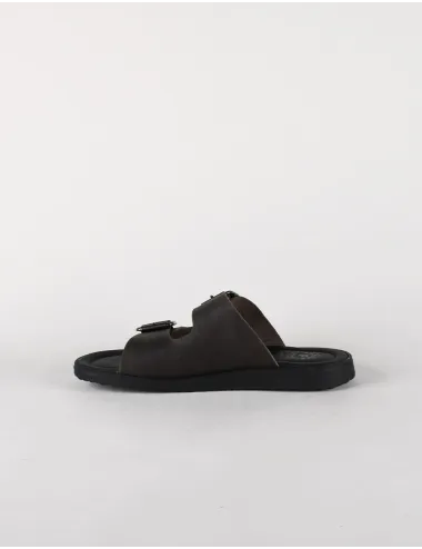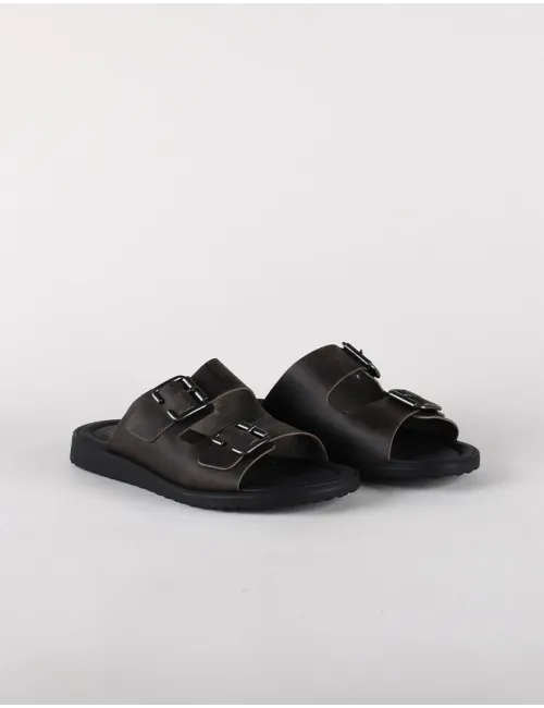 Ciabatta uomo testa di moro con doppio listino regolabile sul collo del piede. Realizzato in pelle con effetto leggermente used. Suola 2 cm. Tomaia in pelle, interno in pelle e suola in gomma.