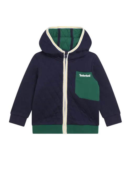 Felpa bimbo blu notte trapuntata con cerniera full zip e cappuccio. Contrasto verde bosco e bianco. Taschino applicato sul petto con logo. Materiale: 60% cotone 40% poliestere