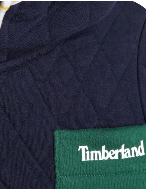 Felpa bimbo blu notte trapuntata con cerniera full zip e cappuccio. Contrasto verde bosco e bianco. Taschino applicato sul petto con logo. Materiale: 60% cotone 40% poliestere