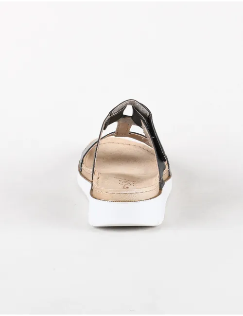 Sandalo donna nero con contrasto antracite metallizzato. Chiusura con strappo velcro regolabile. Suola 4 cm. Tomaia in ecopelle, interno in ecopelle e pelle, suola in gomma