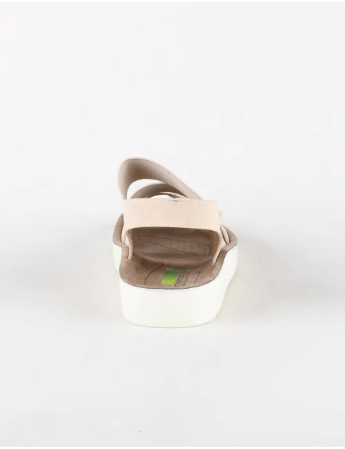 Sandalo donna sabbia con fasce ad incrocio ed inserti in elastico. Strappo velcro regolabile sulla punta. Tacco 2,5 cm. Sottopiede realizzato con sistema di memoria plantare (memorisy). Prodotto con una speciale schiuma di lattice. Estratti di Aloe Vera svolgono un'azione antibatterica. Fessibilità ed antishock. Modello vegano. Tomaia in ecopelle e tessuto, interno in ecopelle e tessuto, suola in gomma