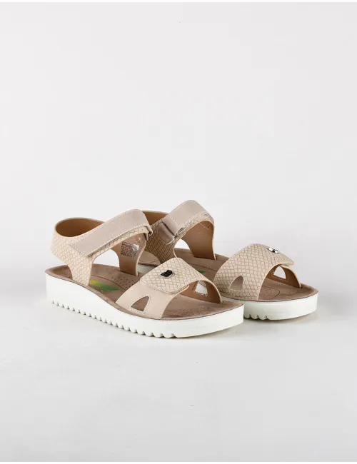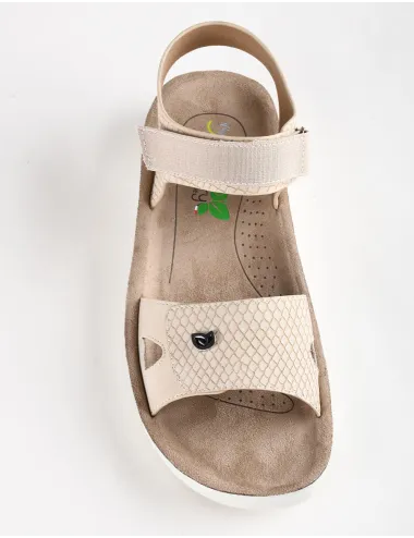 Sandalo donna sabbia con inserti in fantasia rettile. Chiusura con doppio strappo velcro regolabile. Suola 3 cm. Sottopiede realizzato con sistema di memoria plantare (memorisy). Prodotto con una speciale schiuma di lattice. Estratti di Aloe Vera svolgono un'azione antibatterica. Fessibilità ed antishock. Modello vegano. Tomaia in ecopelle e tessuto, interno in ecopelle e tessuto, suola in gomma
