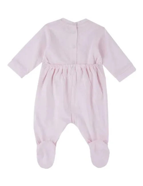 Pagliaccetto bimba rosa con stampa frontale e bottoncini a pressione posteriori per facilitare la calzata. Standard OEKO-TEX. Contiene materiali riciclati. Materiale: 100% cotone