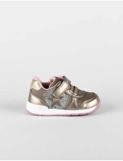 Sneaker bimba brunito in tessuto con contrasto argento ai lati e tallone a contrasto platino. Chiusura con strappo velcro regolabile e lacci elastici. Suola con membrana traspirante e impermeabile, sottopiede antishock. Tomaia in ecopelle e tessuto, interno in tessuto e pelle e suola in gomma.