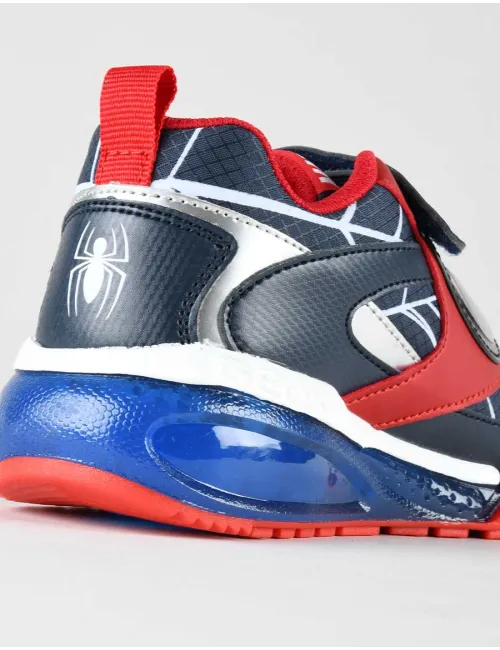 Sneaker bimbo blu notte con grafiche e patch a contrasto rosso e grigio. Realizzata in collaborazione con Marvel a tema Spiderman. Chiusura con strappo velcro e lacci elastici. Suola con membrana traspirante e impermeabile, sottopiede antishock. Suola con luci con bottone on e off. Tomaia in ecopelle e tessuto, interno in tessuto e suola in gomma.