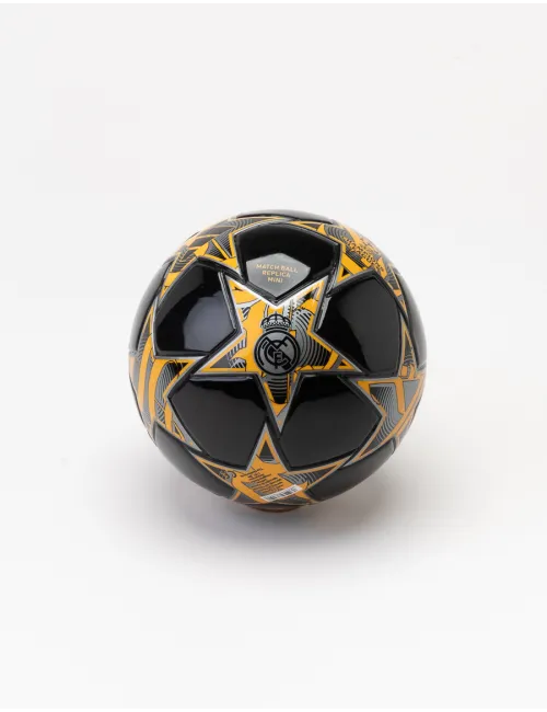 Pallone mini da calcio nero con contrasto senape e antracite dedicato alle tifoserie del Real Madrid. Ispirato al pallone ufficiale della UEFA Champions League, questo pallone mini è perfetto per mostrare le tue abilità grazie alle dimensioni compatte e al nucleo in schiuma. Oltre alla scritta "The Champions" e alle note musicali, 12 stelle risplendono sul robusto rivestimento in poliuretano. Rivestimento 100% poliuretano. Misura: 1.