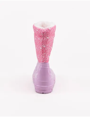 Stivaletto pioggia bimba rosa con contrasti rossi. Parte superiore in tessuto e interno in pelo. Inserto unicorno sul lato esterno. Coulisse che permette di fare aderire bene la tomaia al polpaccio. Tomaia in tessuto e gomma, interno in tessuto e suola in gomma.