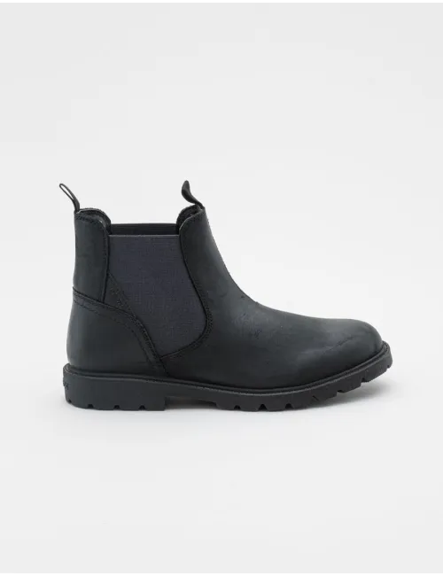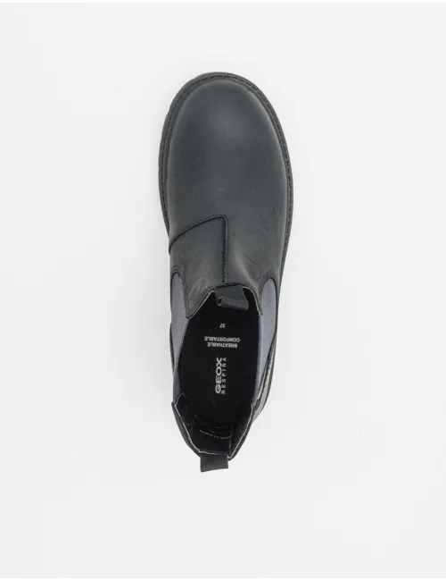 Chelsea bimbo nero alto sopra la caviglia con elastici laterali per facilitare la calzata. Traspirazione della suola grazie al sistema ideato da Geox. Il rinforzo sulla punta protegge da urti ed impatti. Il sottopiede antishock estraibile è igienico e pratico. Accessori in metallo che non rilasciano Nichel. Suola carrarmato 2.5 cm. Tomaia in pelle e tessuto, interno in tessuto ed ecopelle, suola in gomma.