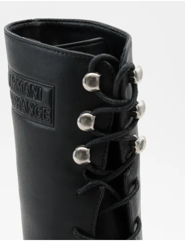 Stivale donna nero alto al polpaccio con logo impresso ai lati tono su tono. Chiusura con lacci elastici. Tacco 4.5 cm. Tomaia in ecopelle, interno in tessuto ed ecopelle, suola in gomma.