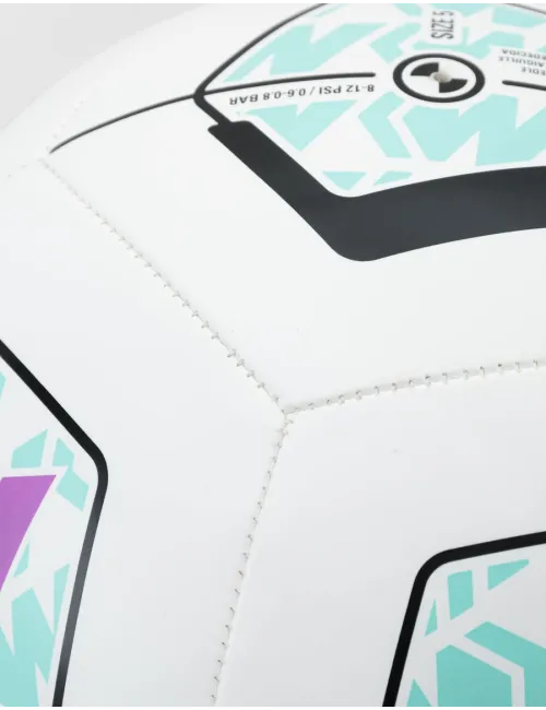 Pallone da calcio bianco con inserti a contrasto turchese e viola, modello Mercurial Fade. Il suo rivestimento cucito a macchina e la sua resistente vescica di gomma garantiscono una maggiore resistenza per lunghe sessioni di gioco. Design a 12 pezzi per una traiettoria precisa e accurata. Misura: 5. Materiali: 60% gomma, 15% poliuretano, 13% poliestere, 12% etilene vinil acetato.