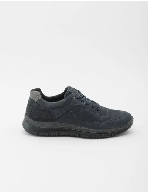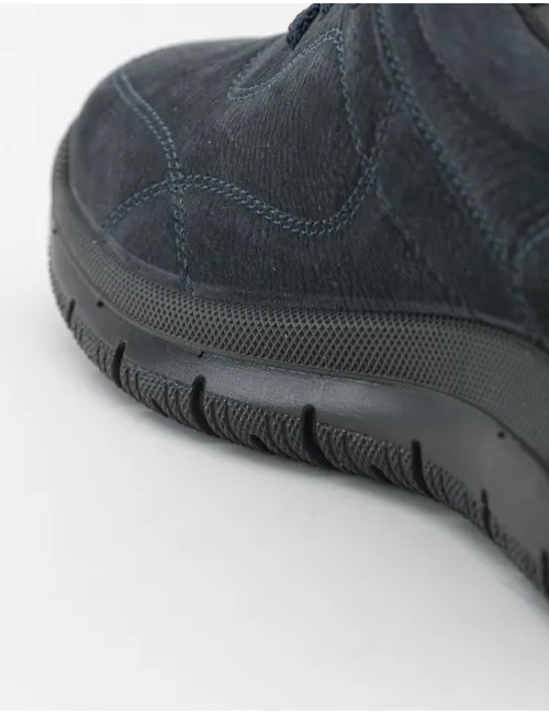 Sneaker uomo navy con lavorazione ad effetto bottolato. Il plantare estraibile in memory foam è rivestito in pelle e assicura ammortizzazione proteggendo il piede dalle sollecitazioni. Il gonfietto alla caviglia assicura un corretto supporto posteriore. Suola comoda, leggera e flessibile per massima aderenza al terreno. Suola antishock 3.5 cm per preoteggerti dagli urti. Tomaia in pelle, interno in pelle e tessuto, suola in gomma.