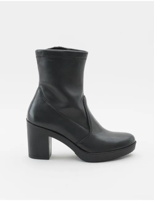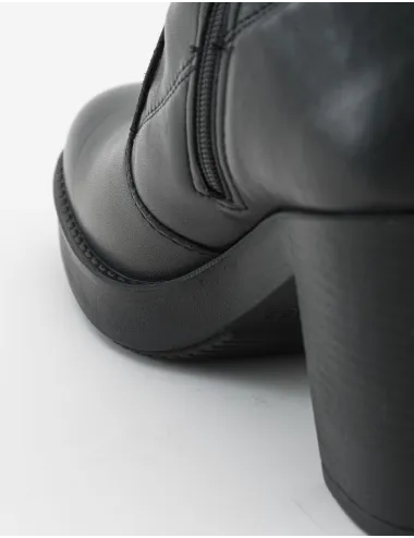 Tronchetto donna nero con cerniera laterale per facilitare la calzata. sottopiede rivestito in pelle in memory foam che attenua i micro-impatti, offre un comodo appoggio al piede adattandosi alla sua conformazione. Suola leggera e flessibile di 8.5 cm. Tomaia in pelle ed ecopelle, interno in pelle e tessuto, suola in gomma.