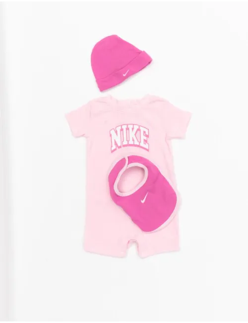 Completo baby rosa coordinato 3 pezzi composto da pagliaccetto, berretto e bavaglino. Pagliaccetto girocollo maniche corte rosa pallido con maxi stampa logo frontale a contrasto rosa e bianco. Chiusura con bottoni a pressione sul retro e sulla gamba. Berretto rosa con logo swoosh ricamato. Bavaglino rosa con logo a contrasto rosa pallido. Chiusura con strappo a velcro regolabile. Materiali 60% cotone e 40% poliestere.