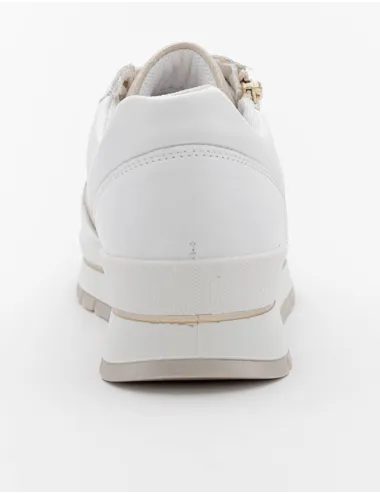 Sneaker donna bianca con lavorazione ad effetto trapuntato per garantire la massima traspirazione. Inserti a contrasto platino. Chiusura con cerniera laterale e lacci elastici per facilitare la calzata. Prodotto realizzato con tecnologia antishock e sottopiede in memory foam estraibile. Suola 4.5 cm. Tomaia in pelle, interno in pelle e tessuto, suola in gomma.