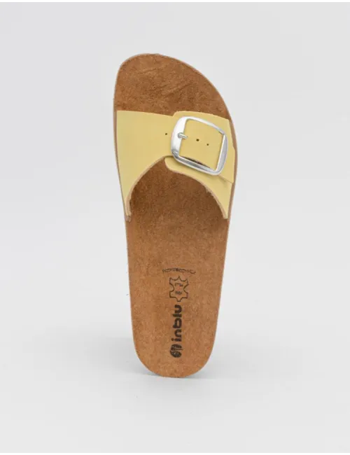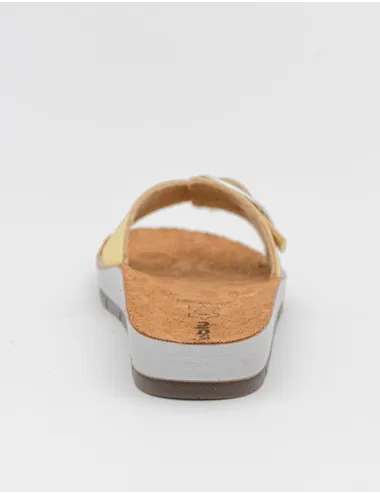 Ciabatta aperta donna giallo con chiusura con fibbia regolabile per un maggiore stabilità del piede. Sottopiede rivestito in pelle per assicurare traspirabilità e igiene. Suola 3 cm. Tomaia in ecopelle, interno in tessuto e pelle e suola in gomma.