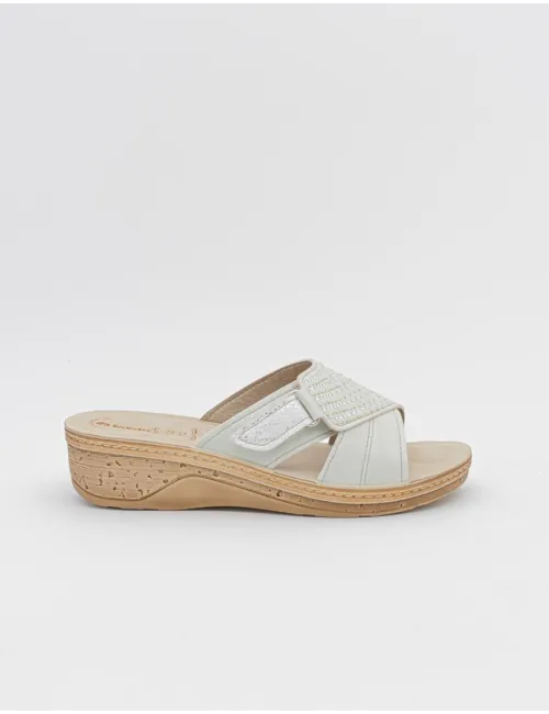 Ciabatta aperta donna crema con strass a contrasto argento e oro. Fascetta singola regolabile con velcro per garantire il massimo comfort. Sottopiede anatomico rivestito in pelle per assicurare traspirabilità e igiene. Suola 4 cm. Tomaia in ecopelle, interno in pelle e tessuto e suola in gomma.