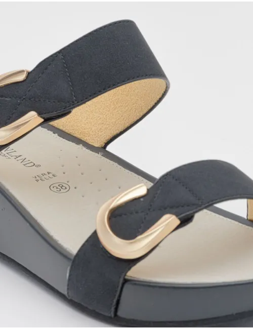 Sandalo platform in pelle donna nero. Chiusura con doppio velcro regolabile per facilitare la calzata. Sottopiede anatomico rivestito in pelle per assicurare traspirabilità e igiene. Plantare con tecnologia re-soft per garantire il massimo comfort e supporto. Suola 4,5 cm. Tomaia in pelle, interno in pelle e tessuto e suola in gomma.