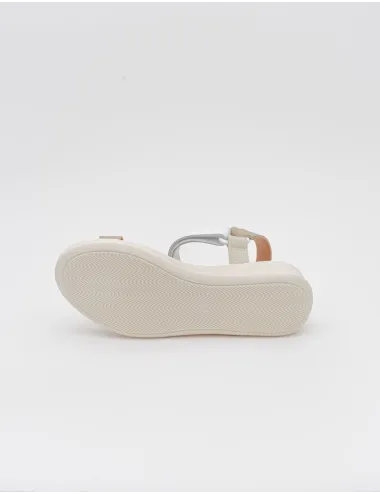 Sandalo in pelle con platform donna taupe con inserti bianchi e beige. Chiusura con velcro regolabile per facilitare la calzata e con cinturino sulla caviglia per una maggiore stabilità del piede. Sottopiede rivestito in pelle per assicurare traspirabilità e igiene. Suola 4,5 cm. Tomaia in pelle, interno in pelle e suola in gomma.