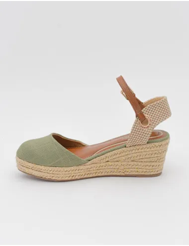 Sandalo con zeppa donna oliva con logo metallizzato a contrasto platino. Chiusura con fibbia regolabile per facilitare la calzata e con cinturino sulla caviglia per una maggiore stabilità del piede. Zeppa con rafia. Suola 6,5 cm. Tomaia in ecopelle e tessuto, interno in tessuto ed ecopelle e suola in gomma.
