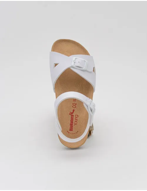 Sandalo bimba bianco. Chiusura con fibbia regolabile per facilitare la calzata e con fibbia regolabile sulla caviglia per una maggiore stabilità del piede. Sottopiede rivestito in pelle per assicurare traspirabilità e igiene. Prodotto di origine vegetale. Suola 2,5 cm. Tomaia in ecopelle, interno in pelle e suola in gomma. Codice prodotto: 22B1005-B-CHABIA.