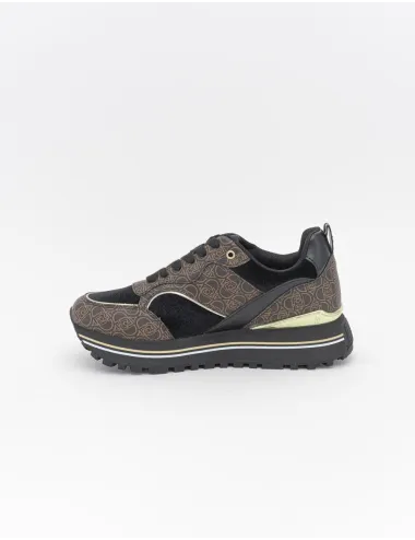 Sneaker donna nera con logo metallizzato a contrasto platino. Inserti con logo beige e in velluto neri. Chiusura con lacci per garantire una calzata sicura e personalizzata. Sottopiede estraibile igienico e pratico. Suola 4 cm. Tomaia in ecopelle e tessuto, interno in tessuto con suola in gomma. Codice prodotto: 73 S18A0.
