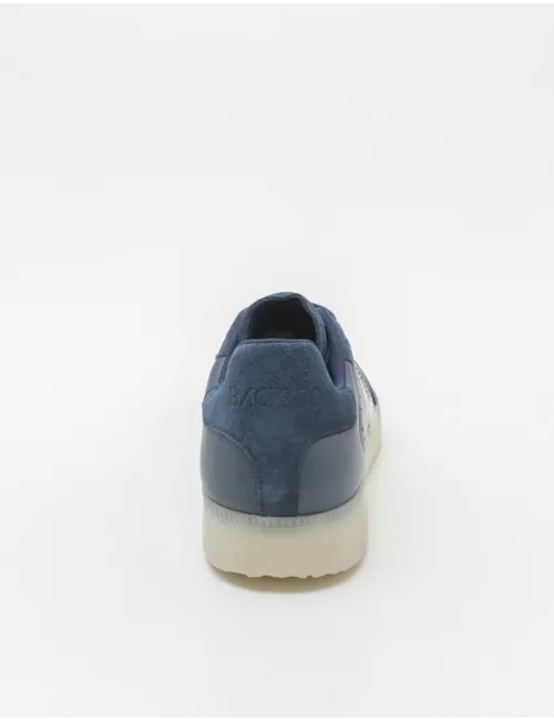 Sneaker uomo blu con logo gommato a contrasto bianco. Dettaglio scamosciato tono su tono sulla punta e sul tallone. Soletta estraibile. Suola 3,5 cm. Tomaia in pelle, interno in tessuto e ecopelle e suola in gomma. Codice prodotto: 108002-000863
