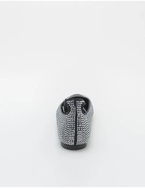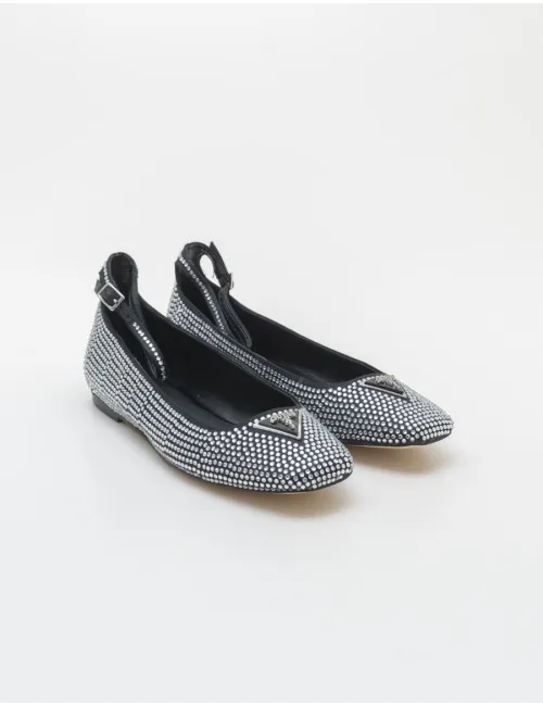 Ballerina donna in satino con applicazione strass. Chiusura con cinturino e fibbia alla caviglia. Dettaglio sulla tomaia a contrasto argento con logo in rilievo. Tomaia in ecopelle, interno in ecopelle e pelle e suola in gomma. Suola: 1 cm.
