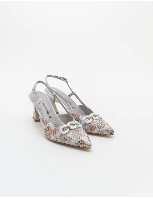 Decolleté donna bianca modello Chanel con listino regolabile su caviglia. Decorazione con varie tonalità di colore marrone. Applicazione metallica in galvanica oro e bianca. Tacco 8 cm geometrico. Tomaia in pelle, interno in pelle e pelle, suola in pelle.
